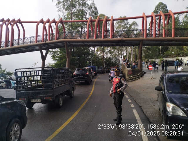Polres Samosir terus mengintensifkan kegiatan pengamanan dalam rangka libur Tahun Baru 2025. Tingginya kunjungan wisatawan, terutama dari Provinsi Sumatera Utara, membuat arus kendaraan roda empat yang masuk dan keluar wilayah Kabupaten Samosir masih terpantau ramai, sabtu ( 4/1 ).