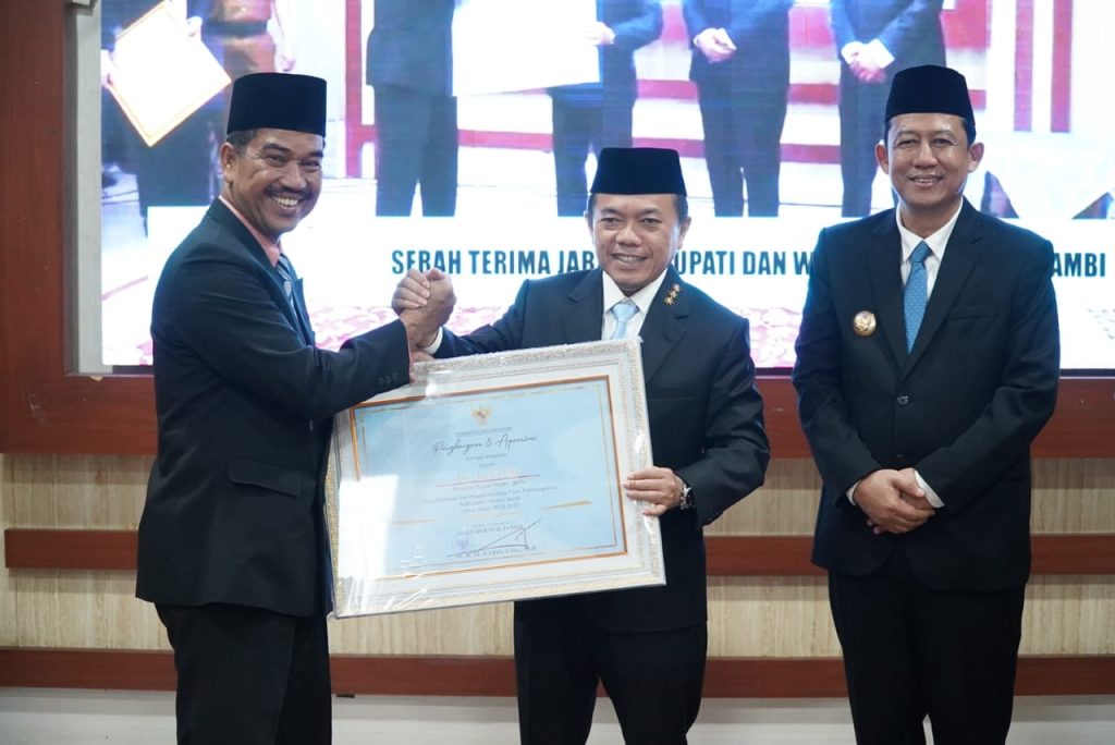 “Terima kasih yang sebesar-besarnya kepada Drs. Raden Najmi, yang telah menyelesaikan masa tugas dengan baik sebagai Pj. Bupati Muaro Jambi. Terima kasih atas kerja keras, karya, dan dedikasi. Semoga upaya yang telah dilakukan, membawa manfaat besar terhadap peningkatan kemajuan Kabupaten Muaro Jambi,” imbuhnya.