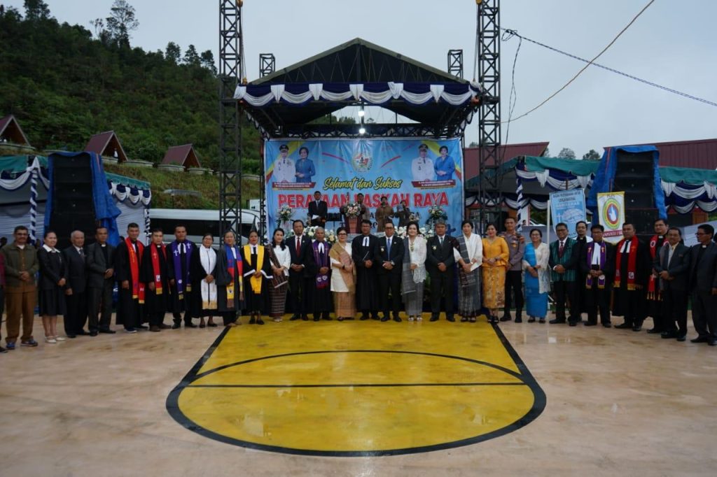 Taput,Prestasireformasi.com Bupati Tapanuli Utara, Dr. Jonius Taripar Parsaoran Hutabarat, S.Si, M.Si, didampingi oleh Ketua TP. PKK Taput, Ny. Angelina JTP Hutabarat Br. Purba, serta Wakil Bupati Tapanuli Utara, Dr. Deni Parlindungan Lumbantoruan, M.Eng, bersama Ketua Bidang II TP. PKK Taput, Ny. Lisa Deni Lumbantoruan Br. Malau hadiri Perayaan Paskah Raya Kabupaten Tapanuli Utara Tahun 2025 bertempat di Menara Pandang. (Selasa, 22 April 2025).