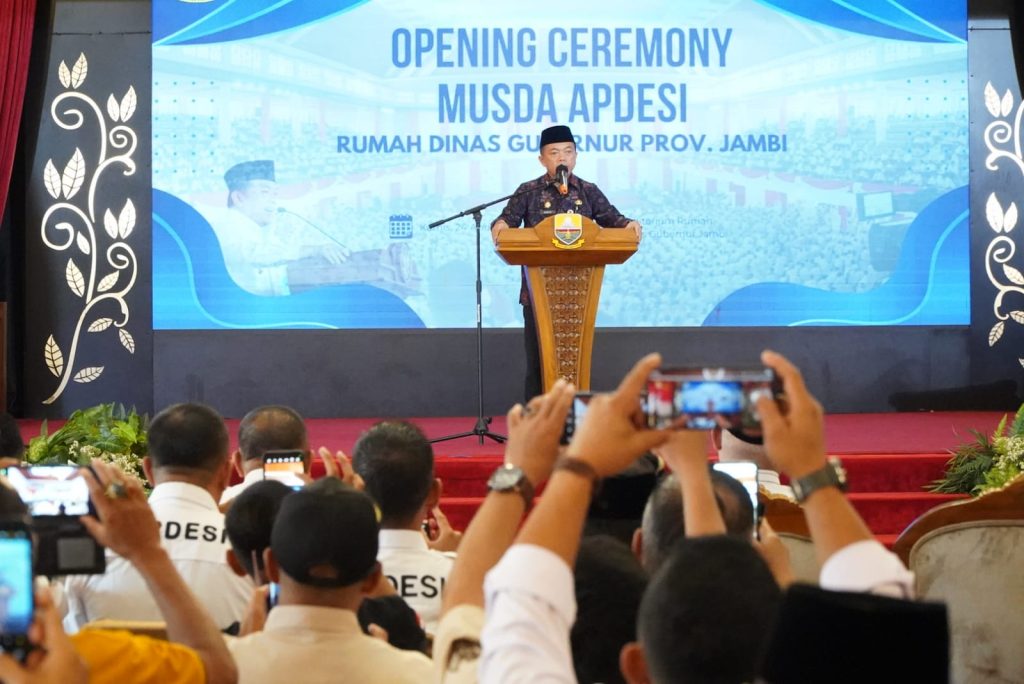 Jambi, PRESTASIREFORMASI.Com – Gubernur Jambi Dr. H. Al Haris, S.Sos, MH mengajak kepala desa yang tergabung dalam Asosiasi Pemerintah Desa Seluruh Indonesia (DPD APDESI) untuk berperan dalam menyukseskan berbagai program pembangunan mendukung program Asta Cita Presiden Republik Indonesia Prabowo Subianto dan Wakil Presiden Republik Indonesia Gibran Rakabuming Raka. Diantaranya program makan bergizi, kemudian program ketahanan pangan dalam mendukung ketersediaan pangan nasional hingga kedaerah, termasuk penurunan angka kemiskinan, stunting dan pemberdayaan UKM serta pembangunan perdesaan. Ajakan tersebut disampaikanya saat membuka Musda Pengurus Asosiasi Pemerintah Desa Seluruh Indonesia (DPD APDESI) Provinsi Jambi, Opening Ceremony Provinsi Jambi tahun 2025, bertempat di Auditorium Rumah Dinas Gubernur Jambi, Kamis (24/04/2025).
