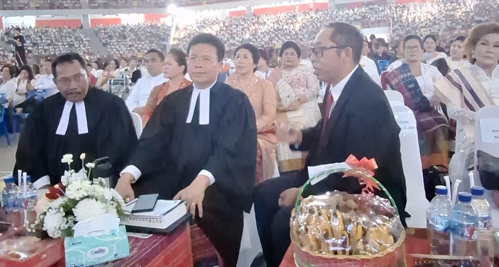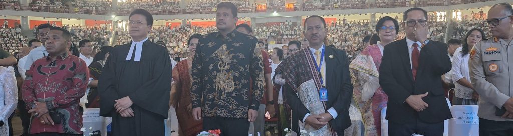 Medan, Prestasireformasi.com Bupati Tapanuli Utara, Dr. Jonius Taripar Parsaoran Hutabarat, S.Si, M.Si, bersama Ketua TP PKK Kabupaten Tapanuli Utara, Ny. Neny Angelina JTP Hutabarat br. Purba, menghadiri Perayaan Paskah Raya HKBP Wilayah Medan dan Sekitarnya yang digelar di Gedung Serbaguna Pemerintah Provinsi Sumatera Utara, Medan, Minggu (27/04/2025).