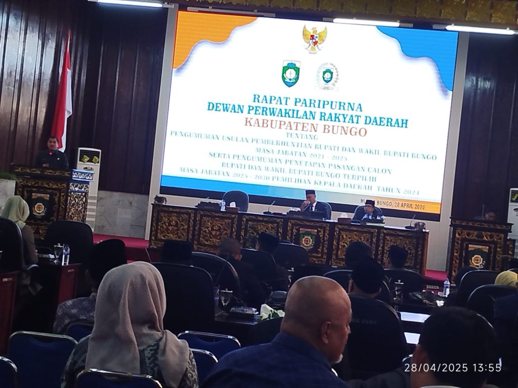 Bungo, PRESTASIREFORMASI.Com – Dewan Perwakilan Rakyat Daerah Kabupaten Bungo menggelar Rapat Paripurna tentang pengumuman usulan pemberhentian Bupati dan Wakil Bupati masa jabatan 2021-2025 serta pengumuman penetapan calon Bupati dan Wakil Bupati Bungo terpilih hasil pemilihan Kepala Daerah tahun 2024 yang dipimpin oleh Ketua DPRD Kabupaten Bungo Muhamad Adani, S.H.,M.Kn yang dilakukan di ruang rapat utama DPRD Bungo, Senin(28/04/2025)