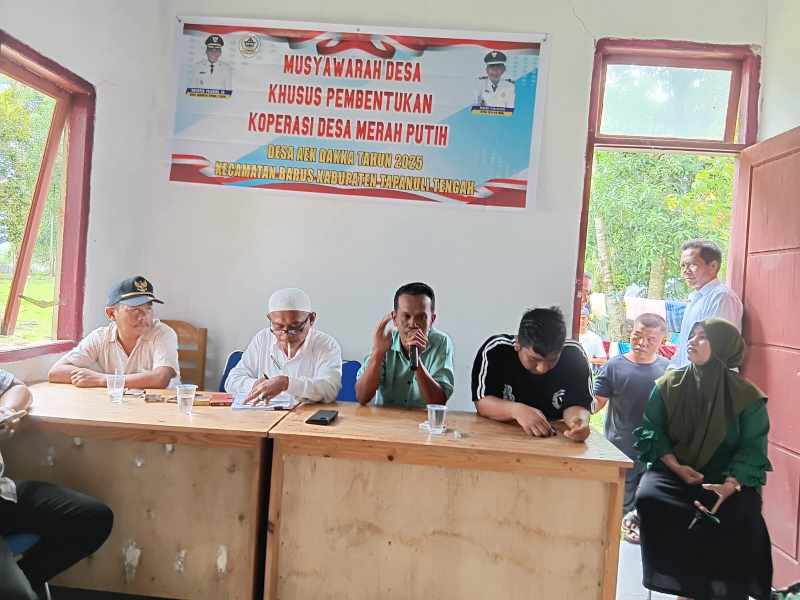 Barus, PRESTASIREFORMASI.Com – Bertempat di kantor Kepala Desa desa Aek Dakka, kecamatan Barus, Rabu (21/5) dilaksanakan musyawarah desa khusus pembentukan koperasi desa Merah Putih desa Aek Dakka.