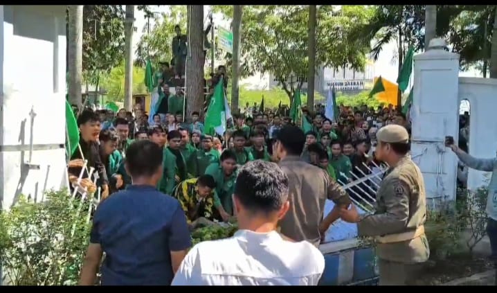 Semula, petugas keamanan masih bisa menahan aksi para demonstran. Namun, karena massa aksi semakin banyak, akhirnya pintu pagar tersebut rubuh dan mengakibatkan kerugian materil sebesar Rp15 juta.