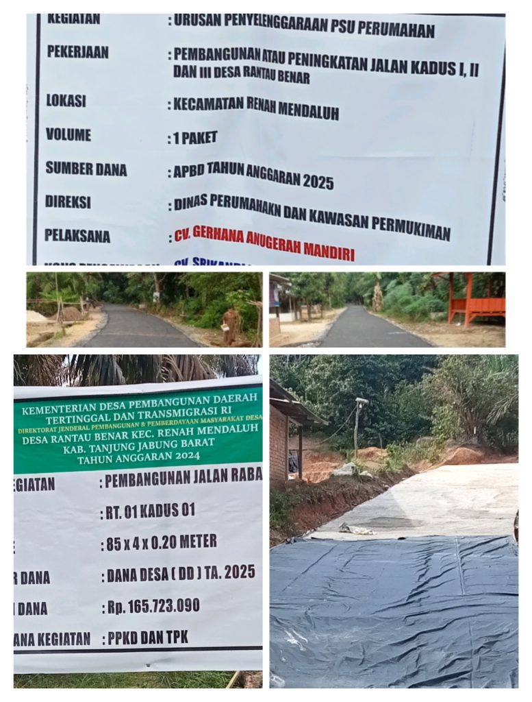 Tanjab barat PRESTASI REFORMSI COM.Kamis 5/6/25.kepala desa Rantau benar kecamatan Renah mendaluh kabupaten Tanjab barat propinsi jambi NYALIM.mengucapkan banyak Ribuan terima kasih kepada pemerintahan kabupaten tanjab barat atas telah di laksanakan pembangunan Aspal dalam desa dari perkim sepanjang 574 meter dengan tebal 5 centi dan lebar 3 meter berjalan baik sesuai dengan Rencana kerja dan mulus seperti pekerjaan empe.walau pun aspal curah alias aspal Goreng namun pekerjaan nya cukup memuaskan beberapa warga masyarakat saat di temui media ini di lokasi mereka semua menjawab kami merasa puas dan senang yang dulu nya tanah dan ada aspal hancur kini sudah bagus dan mulus takobah seperti jalan lintas tutur warga.dan kepala desa Rantau benar NYALIM juga membangun jalan lingkungan Rijid Beton dari dana desa (DD).sepanjang 85 meter lebar 4 meter dengan ketebalan 20 centi meter berada di jalan menuju ke pasentren,yang kini masih dalam pengerjaan sehingga masyarakat pun merasa senang.kades nyalim saat di temui di kediaman nya.menjelas kan saya atas nama pribadi dan mewakili masyarakat betul betul mengucapkan terima kasih pada pemerintahan kabupaten yang sudah membangun jalan aspal dalam desa juga terima kasih pada kontraktor pekerja yang sudah berkerja cukup baik untuk saya dan warga.soal jalan Rijid Beton yah itu dana desa sesuai keputusan rapat semoga para pekerja merasa memiliki atas pekerjaan tersebut tutur nya.kini pekerjaan pengaspalan sudah selesai dan pekerjaan Rijid Beton masih dalam pengerjaan sesuai jangka waktu.mjn.