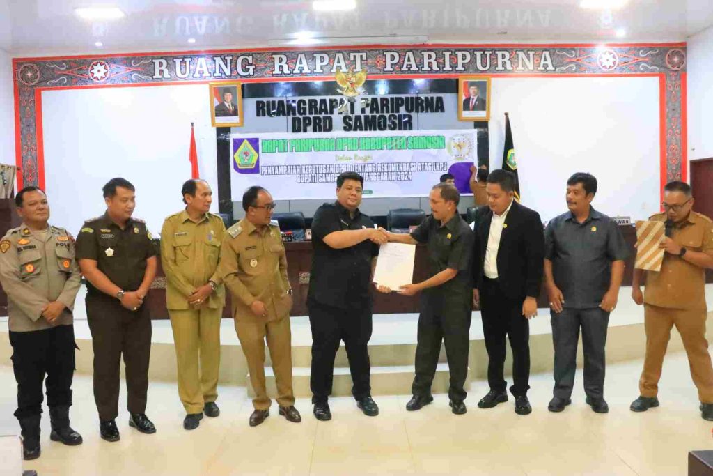 Dewan Perwakilan Rakyat Daerah (DPRD) Kabupaten Samosir secara resmi menyerahkan rekomendasi atas Laporan Keterangan Pertanggungjawaban (LKPJ) Bupati Samosir Tahun Anggaran 2024 kepada Bupati Vandiko T. Gultom dalam rapat paripurna di Gedung DPRD Samosir, Senin (10/6/2025).