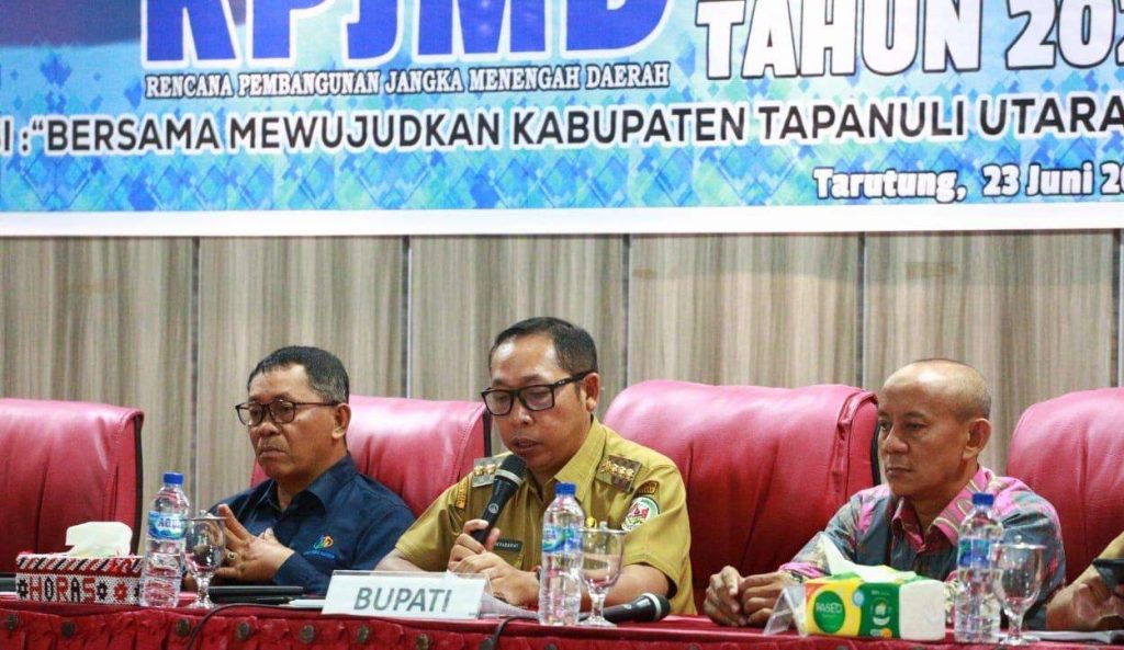 Dalam sambutannya, Bupati JTP Hutabarat menegaskan bahwa penyusunan RPJMD merupakan proses transformasi visi dan misi yang telah disusun pada masa pencalonan menjadi arah dan kebijakan resmi Pemerintah Kabupaten Tapanuli Utara.