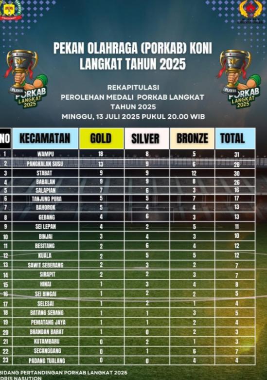 Dalam rekapitulasi terakhir yang dikeluarkan Panitia PORKAB Langkat 2025, Kontingen Kecamatan Wampu tercatat sukses merebut 18 medali emas, 8 medali perak dan 5 medali perunggu, dan duduk di peringkat pertama, disusul Kecamatan Pkl. Susu di peringkat kedua dengan raihan 13 emas, 9 perak dan 6 perunggu. Setelah itu, Kecamatan Stabat di posisi ketiga dengan 9 emas, 9 perak dan 12 perunggu, disusul Kecamatan Babalan dengan 9 emas, 9 perak dan 6 perunggu, Kecamatan Salapian dengan 7 emas, 6 perak dan 3 perunggu serta Kecamatan Tg. Pura dengan 5 emas, 5 perak dan 7 perunggu, dan Kecamatan Bahorok dengan 5 emas, 4 perak dan 4 perunggu.