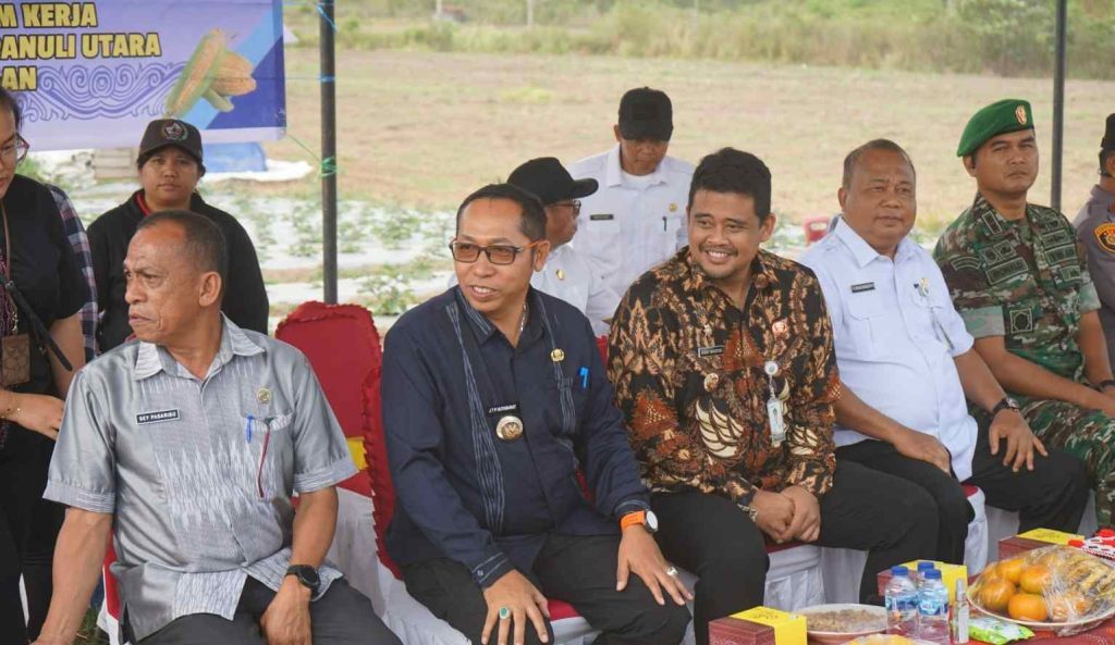 Taput, PRi. Com – Bupati Tapanuli Utara, Dr. Jonius Taripar Parsaoran Hutabarat, S.Si, M.Si yang didampingi istri Neny Angelina Purba, Kapolres Taput AKBP Ernis Sitinjak, SH, S. IK, Dandim 0210/TU Letkol Kav Ronald Tampubolon, SH. M. Han bersama Gubernur Sumatera Utara, Moh. Bobby Afif Nasution melakukan Gerakan Tanam Jagung di Kecamatan Parmonangan yang merupakan Kolaborasi Sumut Berkah Menuju Swasembada Pangan di Desa Hutatinggi Kecamatan Parmonangan, Kabuapaten Tapanuli Utara. Jumat (25/7/2025).