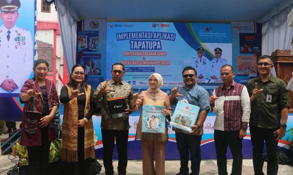 Taput, PRi. Com – Bupati Tapanuli Utara, Dr. Jonius Taripar Parsaoran Hutabarat, S.Si., M.Si menghadiri acara Launching Aplikasi TAPATUPA (Transformasi Pengelolaan Aset Tanah Tapanuli Utara), Penyerahan CSR PT. Bank Sumut serta Sosialisasi Simpanan Pelajar (SIMPEL) yang digelar di Taman Menara Lonceng, Tarutung, Kamis (21/8/2025).