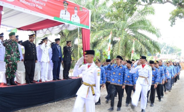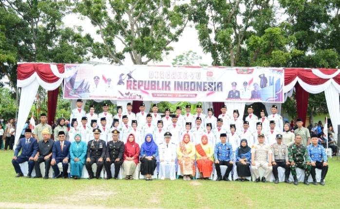 Momentum bersejarah diisi dengan kegiatan Upacara pengibaran bendera Merah Putih yang dilakukan di Tanah lapang Desa Baru Pasar Vlll, Minggu (17/08/2025).