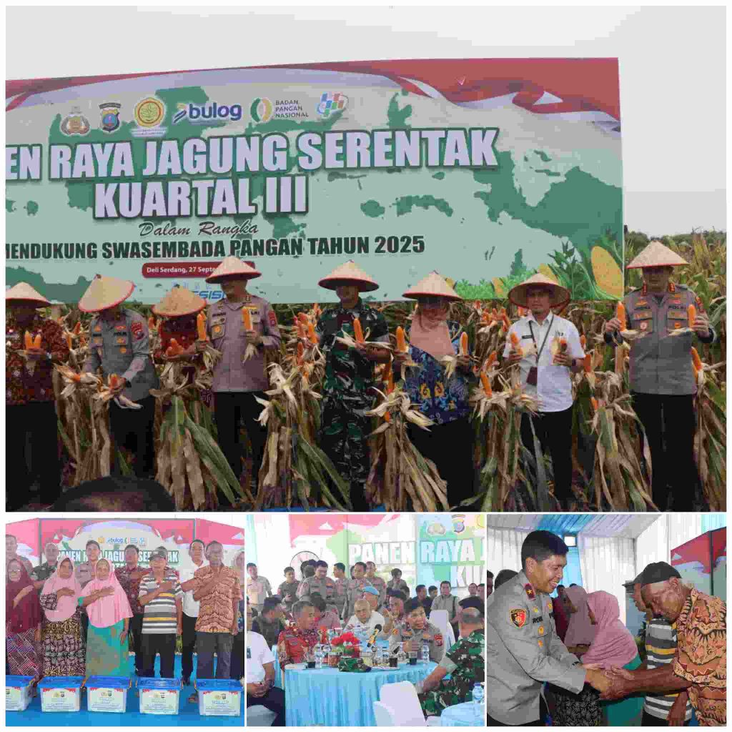 Deli Serdang, PRi.Com – Upaya mendukung ketahanan pangan nasional, Kepolisian Resor Kota Deli Serdang, Polda Sumatera Utara, kembali menggelar Panen Raya Jagung Serentak Kuartal III di Desa Telaga Sari, Kecamatan Tanjung Morawa, Kabupaten Deli Serdang, pada Sabtu (27/9/2025).