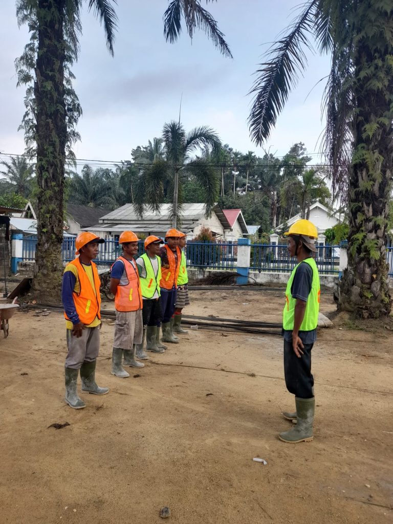 Selain fokus pada kualitas pembangunan, SMKN 3 Bungo juga menaruh perhatian besar terhadap penerapan Keselamatan dan Kesehatan Kerja (K3) di lapangan. Setiap pagi, para pekerja melakukan evaluasi hasil pekerjaan sebelumnya untuk memastikan keamanan dan kualitas tetap terjaga.