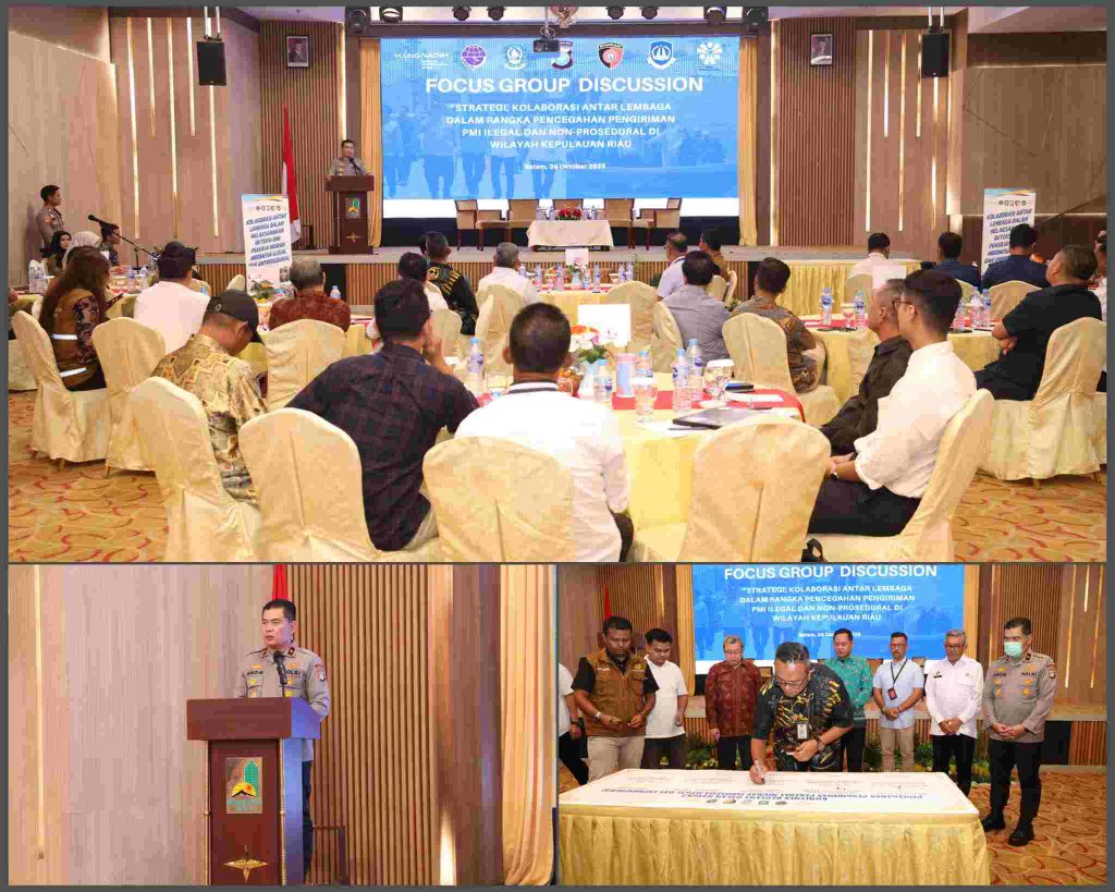 Batam/Kepri, PRi.Com – Dalam rangka memperkuat koordinasi dan kolaborasi antar lembaga dalam upaya pencegahan pengiriman Pekerja Migran Indonesia (PMI) ilegal dan non-prosedural, Polda Kepulauan Riau melalui Direktorat Intelkam menggelar Focus Group Discussion (FGD) bertema “Strategi Kolaborasi Antar Lembaga dalam Rangka Pencegahan Pengiriman PMI Ilegal dan Non-Prosedural di Wilayah Kepulauan Riau”, bertempat di Hotel Nagoya Hill Batam, Kamis (30/10/2025).