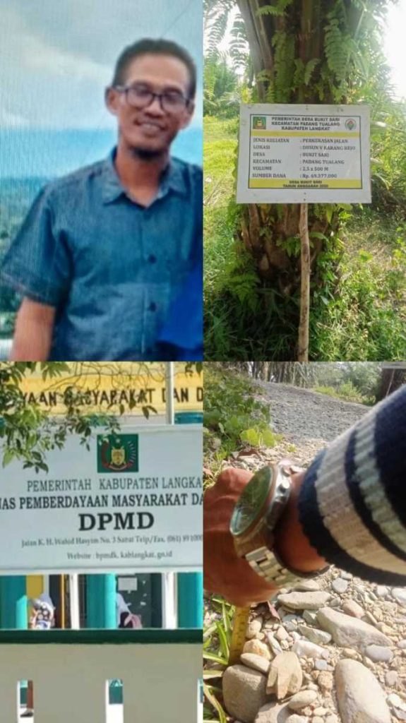 Langkat,PRESTASIREFORMASI.Com – Terkait dengan Pemberitahan kasus Dugaan Korupsi Proyek Pekerjaan Pengerasan jalan di dusun V Karang rejo Desa Bukit Sari Kecamatan Padang Tualang Kabupaten Langkat tahun 2025 dengan ukuran 500 m X 2,5 m X 0,15 m dan nilai Proyek Rp 69.377.000.00 dan Setelah diukur ketebalannya menggunakan meteran realisasi Perkerjaan dilapangan hanya 0,04 m jauh berbedah dari volume yang harus dikerjakan 187,5 m serta di kurang panjang jalan rusak yang ditimbun separuhnya 250 m menjadi volume 118,75 m jadi Diduga kerugian negara harus di pulangkan dalam volume 68,75 m dan dalam uang Rp 25.438.187,