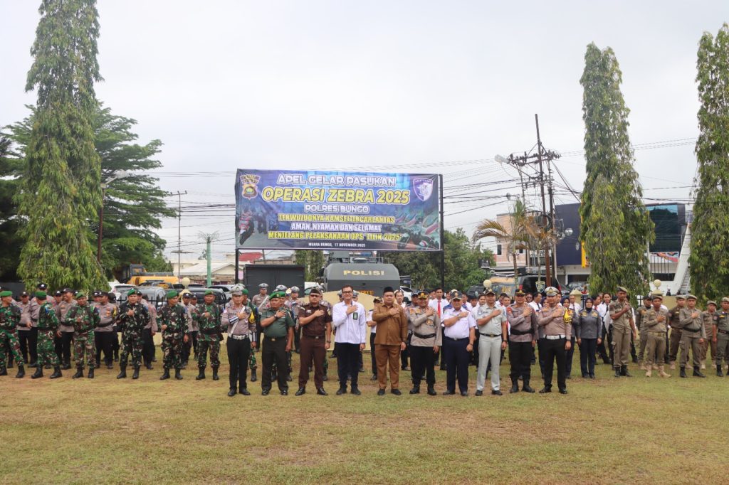 Bungo, PRESTASIREFORMASI.Com – Polres Bungo menggelar Apel Gelar Pasukan Operasi Zebra 2025 dengan tema “Terwujudnya Kamseltibcarlantas Aman, Nyaman dan Selamat Menjelang Pelaksanaan Ops Lilin 2025” pada Senin, 17 November 2025, bertempat di halaman Mako Polres Bungo.