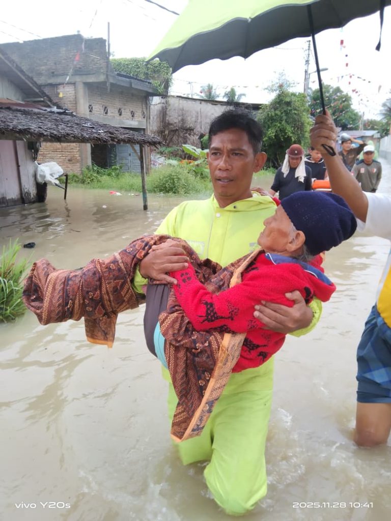 “Debit air di Sungai Rampah terpantau sangat tinggi dan telah meluap, memasuki perkampungan di sekitarnya, Melihat kondisi ini, prioritas utama kami adalah keselamatan warga. Bersama aparat desa, kami bergerak cepat melakukan evakuasi dan mendirikan posko-posko untuk menampung warga yang mengungsi,” Pungkasnya, sesaat setelah berhasil mengamankan seorang nenek yang digendongnya.
