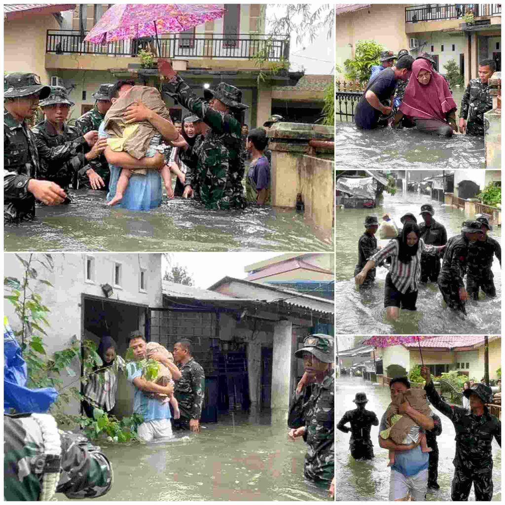 Medan, PRi.Com – Prajurit Yonkav 6/NK bergerak cepat mengevakuasi warga masyarakat yang terjebak banjir di Gang Family, Lingkungan V, Kelurahan Asam Kumbang, Kota Medan, Kamis (27/11/2025). Banjir dengan ketinggian sekitar 1,5 meter merendam puluhan rumah warga masyarakat setelah hujan deras mengguyur wilayah tersebut sejak pagi hari.