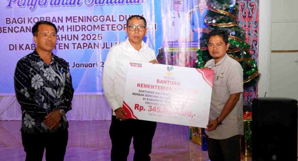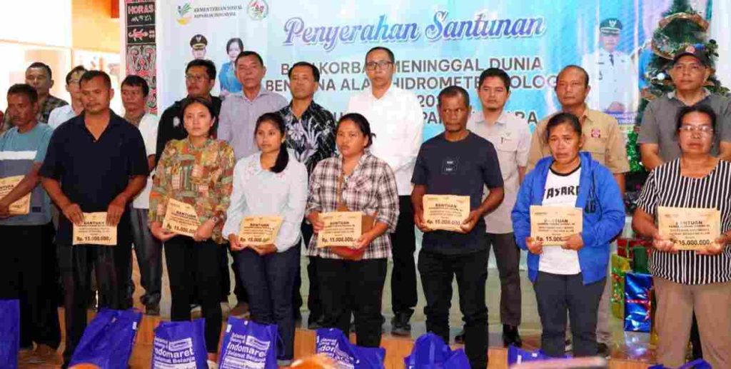 Taput, PRi. Com – Bupati Tapanuli Utara Dr. Jonius Taripar Parsaoran Hutabarat, S.Si, M.Si menyerahkan santunan kepada 23 ahli waris korban meninggal dunia akibat bencana hidrometeorologi yang terjadi sepanjang tahun 2025 di Kabupaten Tapanuli Utara bertempat di Kantor Dekranasda Kabupaten Tapanuli Utara, Tarutung. (Sabtu, 24 Januari 2026).