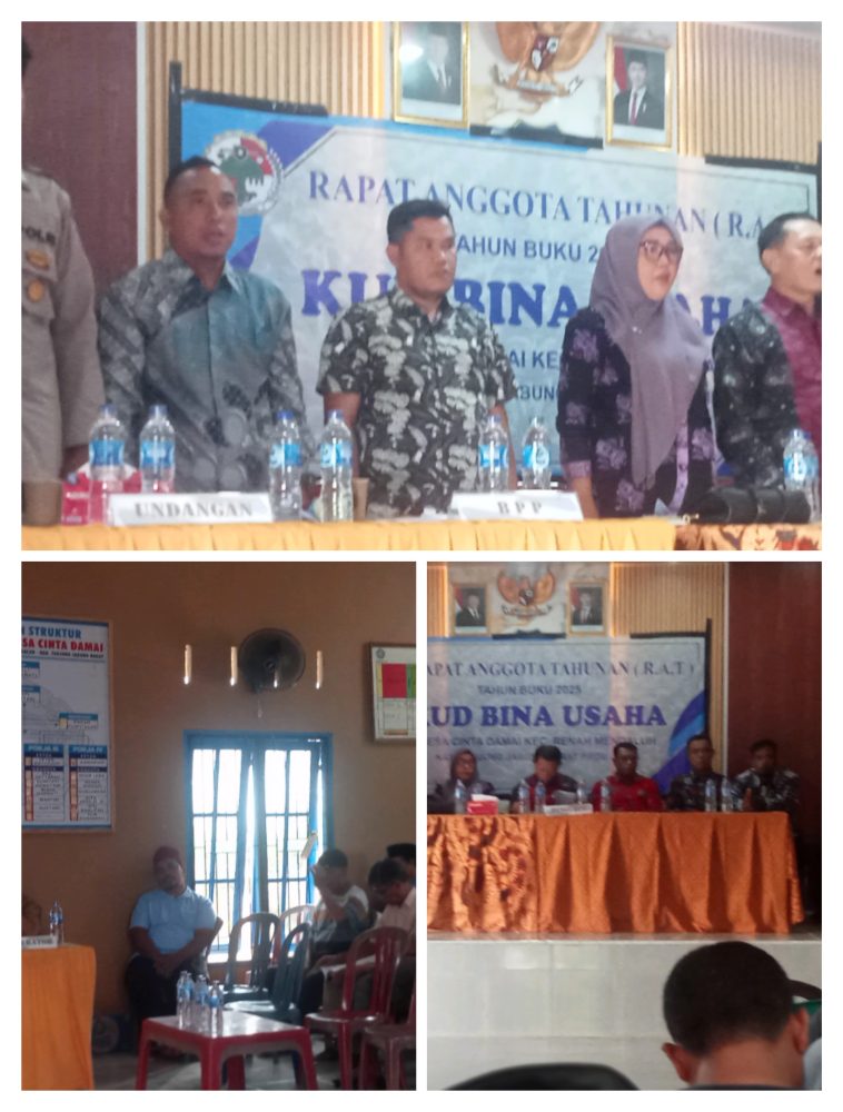 Tanjab barat PRESTASI REFORMASI Com.sabtu 31 01 2026.KUD Bina usaha Desa cinta damai kecamatan Renah mendaluh kabupaten tanjab barat propinsi jambi lakukan Rapat akhir Tahunan sekaligus pembentukan pengurus baru.dalam rapat tersebut hadir Camat Renah mendaluh SUHARDI se,kepala Desa cinta damai YULPANI,dinas koperindak kabupaten tanjab barat di wakili ibu TATI,Babinsa dan kapolpos lampisi dan cinta damai juga di hadiri anggota KUD tersebut sebanyak 450 anggota di wakili sebanyak 122 anggota.dalam rapat tersebut ketua KUD Bina usaha bapak PIKTOR HUTABARAT menyampaikan pertanggung jawaban tahunan serta memaparkan hasil serta hutang piutang para anggota terhadap koperasi.anggota petani sawit koperasi dalam Replanting nya terdapat sistim kemitraan dan sistim mandiri.sistim kemitraan dalam Replanting nya bermitra dengan PT Inti indosawit subur (IIS) dan mendiri di bantu pendanaan Replanting nya dari kementrian perkebunan melalui dinas perkebunan propinsi dan kabupaten.dalam acara tersebut juga hadir pihak menejemen PT IIS dan stap nya.kepala desa cinta damai YULPANI dalam sambutan nya menghimbau serta mengharapkan semua petani baik kemitraan dengan perusahaan mau pun mendiri agar dapat bergabung kesemua nya pada KUD bina usaha terutama dalam kepengurusan D,O.supaya koperasi tersebut bisa lebih maju lagi.sama hal nya koperindak yang di wakili ibuk TATI dan kawan kawan mengharapkan koperasi tersebut pengurus nya transparan serta memajukan koperasi lebih maju lagi.pihak pengawas bapak AG MAIMAN juga dalam sambutan nya memaparkan perjalanan koperasi ini sudah berjalan lebih kurang selama 30 tahun semenjak berdiri nya desa cinta damai,menurut nya KUD ini di dirikan pada tahun 2003.pengakuan nya dalam perjalan selama ini selalu banyak kendala tapi alhumdulilah bisa di atasi semua dan harapan nya nanti setelah terbentuk pengurus baru dapat berjalan dengan baik dan dapat lebih maju lagi tutur nya.Desa cinta damai merupakan desa pemekaran melalui program transmigrasi yang bermitra dengan PT Inti Indosawit subur (IIS) pada mula nya kini sudah resmi di jadi kan desa deponitip sama hal nya dengan desa asal atas hak dan kewajiban nya.marjuni.