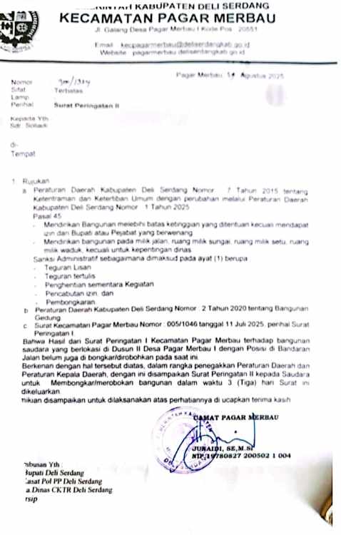 Pagar Merbau/DS, PRi.Com – Keberadaan bangunan liar yang berdiri di wilayah Kecamatan Pagar Merbau, Kabupaten Deli Serdang, hingga kini belum juga ditertibkan meski telah diterbitkan Surat Peringatan (SP) I Nomor 005/1046 Tanggal 11 Juli 2025 dan Surat peringatan II Nomor 300/1324 Tanggal 19 Agustus 2025 oleh pihak kecamatan.