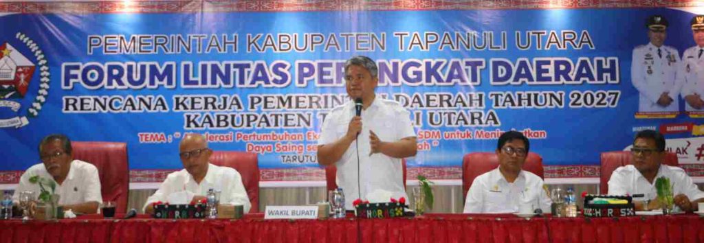 Taput, PRi. Com – Wakil Bupati Tapanuli Utara Dr. Deni Parlindungan Lumbantoruan, M.Eng, didampingi Sekretaris Daerah Drs. Henry M. M. Sitompul, M. Si membuka secara resmi Forum Lintas Perangkat Daerah Rencana Kerja Pemerintah Daerah (RKPD) Tahun 2027 Kabupaten Tapanuli Utara dengan tema “Akselerasi Pertumbuhan Ekonomi dan Kualitas SDM untuk Meningkatkan Daya Saing serta Ketahanan Daerah”, bertempat di Aula Martua Kantor Bupati Tapanuli Utara, Tarutung, Rabu (11/3/2026).