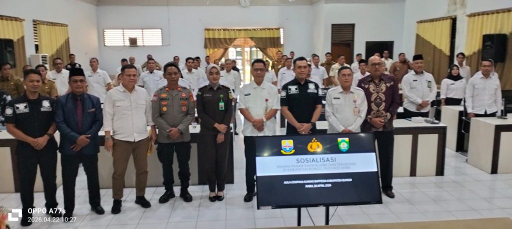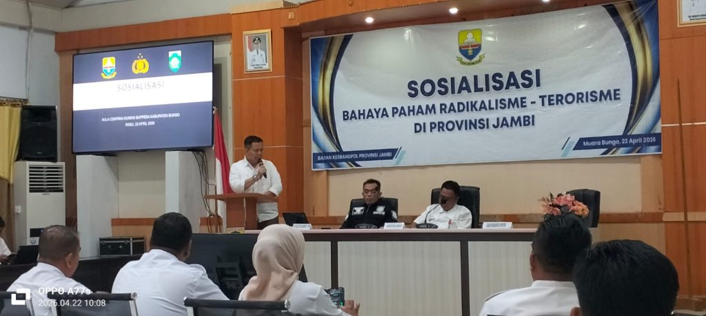 Bungo, PRESTASIREFORMASI.Com – Pemerintah Provinsi Jambi melalui Badan Kesbangpol menggelar kegiatan sosialisasi bahaya paham radikalisme dan terorisme di Kabupaten Bungo, Rabu (22/4/2026). Kegiatan berlangsung di Ruang Pola Cempaka Bappeda Bungo dan dihadiri berbagai unsur pemerintah serta aparat keamanan.