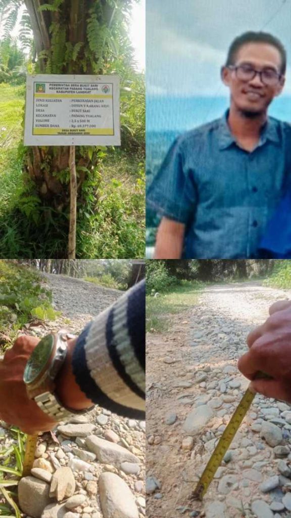 Langkat, PRESTASIREFORMASI. Com – Ada yang menarik ketika media Prestasireformasi.com mengunjungi Desa Bukit sari kecamatan sei lepan kabupaten langkat, Saat masuk kedalam kantor desa, terdapat disisi sebelah pintu masuk info Grafik tahun 2025 beserta foto Pekerjaan fisiknya. saat dicermati terdapat kejanggalan, terlihat dari foto Perkerasan mulai dari titik 0 sampai selesai tidak ada ditemukan foto ketebalan setelah selesai Pekerjaannya disisi lain tidak ada alat berat (Stoom wholes) dan terlihat Pekerjaannya berada diareal perkebunan.