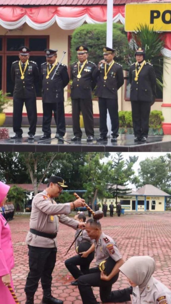 Langkat,PRESTASIREFIRMASI.Com – Kapolres Langkat pimpin upacara kenaikan pangkat pengabdian dan pelepasan personel purna Tugas Kamis (30/10/25). “Iya benar hari ini Kami Polres Langkat melaksanakan Upacara Purna Tugas yang telah berakhir masa tugasnya di Kepolisian Republik Indonesia terhadap Lima Personil Polres Langkat Yaitu Akp MuIiana,Ipda Muliono, Ipda Wahyu Pribadi, Aiptu Kasir dan Aiptu Ahmad Habib Rifai, selain itu Kami juga sekaligus melaksanakan Upacara kenaikan Pangkat atas pengabdian Kasat Samapta AKP Mohammad Kamaruddin Daulay,S.H. dan Kapolsek Stabat AKP Sisbudianto, dari AKP naik setingkat lebih tinggi menjadi Kompol.” Jelas Kapolres Langkat AKBP David Triyo Prasojo SH, SIK, Msi,