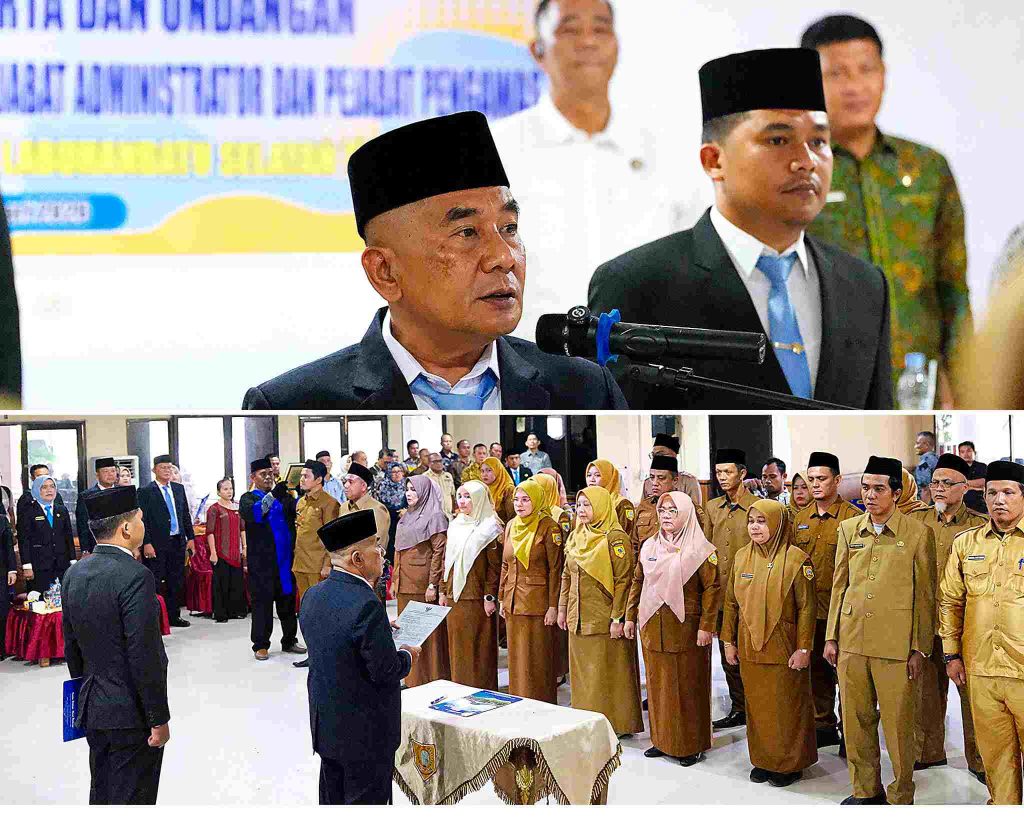 Prosesi pelantikan diawali dengan pengambilan sumpah jabatan, dilanjutkan penandatanganan berita acara pelantikan oleh pejabat yang dilantik bersama Bupati Labusel.