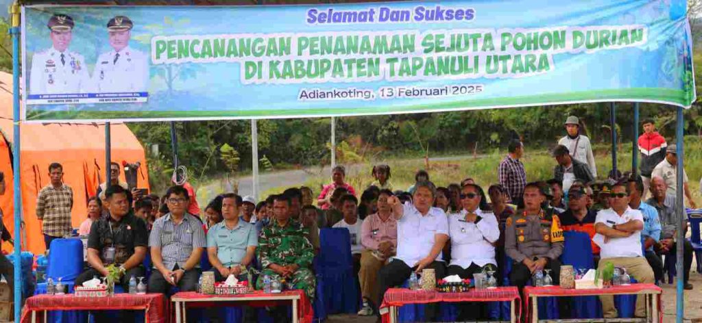 โโTaput, PRi. Com – Bupati Tapanuli Utara Dr. Jonius Taripar Parsaoran Hutabarat, S. Si., M. Si didampingi Wakil Bupati Dr. Deni Parlindungan Lumbantoruan, M.eng, Kapolres Tapanuli Utara AKBP Ernis Sitinjak, S.H., S.I.K, sejumlah pimpinan perangkat daerah beserta masyarakat terdampak bencana alam secara resmi mencanangkan Gerakan Penanaman Sejuta Pohon Durian sebagai bagian dari upaya penghijauan dan pemulihan lingkungan pascabencana hidrometeorologi. Kegiatan tersebut dipusatkan di lokasi Hunian Tetap Desa Dolok Nauli, Kecamatan Adiankoting, Jumat (13/2/2026).โโ